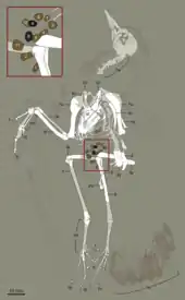 The skull in all known specimens is poorly preserved, but in general appears to have had a narrow snout compared to the closely related Longicrusavis.[2] The teeth were very small and are poorly preserved in all known specimens. At first, this led scientists to conclude that the teeth were absent in both the upper and lower jaws, probably replaced with a beak. However, later study of the type specimen showed that tooth sockets were present in the preserved parts of the jaw, and comparison with related forms showed that it did have teeth.[3] The discovery of a more well preserved specimen confirmed the presence of teeth in at least the maxilla (middle of the upper jaw) and dentary (lower jaw). The snout appears to have lacked feathers, though whether it was only covered in skin or some parts bore a beak is currently unknown. The describers of Hongshanornis noted a unique bone in the end of the lower jaw which they equated with the beak-bearing "predentary bone" similar to the one found in ornithischian dinosaurs. Such bones have also been found in more advanced birds like Hesperornis.[4] However, other scientists have pointed out that the "predentary" (or, technically, mandibular symphysial ossification) of Hongshanornis lacks the characteristic pits and grooves associated with the beak in early beaked birds like Archaeorhynchus, and that the presence or absence of any beak is unclear.[3][2]