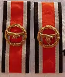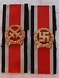 Nazi era awards were initially banned by the post-war Federal Republic of Germany. In 1957 many World War II military decorations, including the Honour Roll Clasp, were re-authorised for wear. Re-designed to remove the swastika symbol, the army version now displayed two crossed swords in the centre, with the Navy and Air Force clasps unchanged apart from the absence of the swastika. Members of the Bundeswehr could wear the clasp on the ribbon bar, represented by a small replica of the award on an iron cross ribbon.[8]