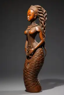 Hoodoo also has some Vodun influence. For example, a primary ingredient used in goofer dust is snakeskins. Snakes (serpents) are revered in West African spiritual practices, because they represent divinity. The West African Vodun water spirit Mami Wata holds a snake in one hand. This reverence for snakes came to the United States during the slave trade, and in Hoodoo snakeskins are used in the preparation of conjure powders.[152] Puckett explained that the origin of snake reverence in Hoodoo originates from snake (serpent) honoring in West Africa's Vodun tradition.[153] It was documented from a former slave in Missouri that conjurers took dried snakes and frogs and ground them into powders to "Hoodoo people." A conjurer made a powder from a dried snake and a frog and put it in a jar and buried it under the steps of the target's house to "Hoodoo the person." When the targeted individual walked over the jar they had pain in their legs. Snakes in Hoodoo are used for healing, protection, and to curse people.[154][116][117]