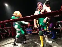 The Stoner Brothers, a popular duo at Hoodslam, wrestling Bat Manuel and El Chupacabra