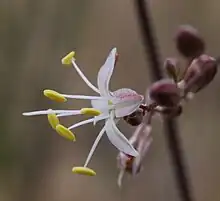 Hooveria parviflora is a species of perennial herb in the Agave/Yucca subfamily known by the common name smallflower soap plant. It is a monocot, native to coastal southern California and Baja California, where it is a member of the coastal sage scrub flora. It resembles a smaller version of Chlorogalum pomeridianum, with wavy leaves and white flowers that open during the day.