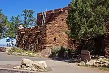 Mary Colter had worked on a number of projects for the Fred Harvey Company, principally as an architect and interior designer. She was particularly successful in a similar project, the Indian Building at the Fred Harvey Company's Alvarado Hotel (now demolished) in Albuquerque, New Mexico.[3] Colter planned Hopi House as a sort of living museum, in which Hopi Indians could live while making and selling traditional crafts. The structure was based on Colter's interpretation of the Hopi dwelling at Oraibi, Arizona. The ethnohistorically-correct structure was at the time of its construction the first introduction for many park visitors to the architecture and life of the native peoples of Arizona, New Mexico, Utah and Colorado.[4] A variety of interior spaces provide museum, sales and demonstration space.[5]