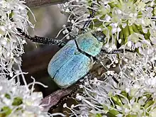 The adults of Hoplia argentea grow up to 9–12 millimetres (0.35–0.47 in) long. It is a very variable chromatic species. The body of these medium-sized flower-loving scarabs is covered with pale green, bluish-green or yellow ocher scales. The scales produce interference colors (as with butterflies). Old specimens lose most of the scales, changing their color from green to brown. Like other species of the genus Hoplia, it has fairly long hind legs terminated by a single nail. The legs in males are black with longer hind legs, while in the female they are reddish and the body colour is usually brown.[4]