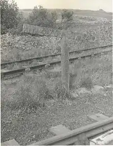 By the 1870s Hopton Incline's winding engine had given 40 years' service and was life-expired. During that time locomotive power had moved on, therefore in 1877 Hopton incline's chains and engines were removed, after which the incline became a conventional adhesion railway; trains ascended the bank under their own power and descended using their own brakes. The more westerly line on the incline fell into disuse and was lifted at some time between 1889 and 1903.[11] In 1886 an inspector recommended the gradient be eased to allow greater loads, but nothing happened until 1903[12] when the trackbed at the foot of the incline was raised to ease the slope, which northbound trains approached at the gently downhill gradient of 1 in 1056. The top was also shaved to ease a short final stretch to 1 in 470. From the bottom the amended slope became progressively steeper in stages: 1 in 60 for 200 yards (180 m), 1 in 30 for 75 yards (69 m), 1 in 20 for 100 yards (91 m), then 200 yards (180 m) at 1 in 14, easing to 1 in 470 before levelling off.[2][13] The approach was gently downhill, but it included what in railway terms was a fairly sharp bend of 20 chains (400 m) radius, 160 yards (150 m) before the incline foot.