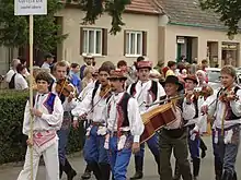 Traditional costume of Horňácko represents an important and characteristic part of local folk culture. The folk costume is classified as a "mountain-type", similarly as the folk clothing at Moravian Wallachia or Kopanice.[8] The oldest influences may perhaps come from the pagan eras. The white color is considered funerial, which is similar to the customs of the old Slavs. The characteristic embroidery of Horňácko has its roots in the Renaissance period.