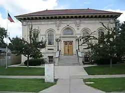 Hornell Public Library is a historic library building located at Hornell in Steuben County, New York, USA. It was designed in 1908 and dedicated in 1911, with funds provided by the philanthropist Andrew Carnegie. It is one of 3,000 such libraries constructed between 1885 and 1919. Carnegie provided $25,000 toward the construction of the Hornell library. It is a one-story, five bay structure built of white pressed brick with masonry trim.[2]