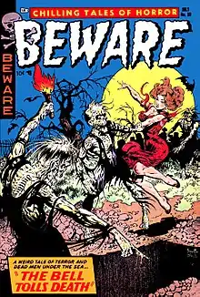 EC's success immediately spawned a host of imitators, such as Ziff-Davis' and P.L. Publishing's Weird Adventures,[34] St. John Publications' Weird Horrors,[35] Key Publications' Weird Chills,[36] Weird Mysteries[37] and Weird Tales of the Future,[38] Comic Media's Weird Terror,[39] Ziff-Davis' Weird Thrillers,[40] and Star Publications' Ghostly Weird Stories.[41] Others included Quality Comics' Web of Evil,[42] Ace Comics' Web of Mystery,[43] Premier Magazines' Horror from the Tomb[44] Harvey Comics' Tomb of Terror, Witches Tales, and Chamber of Chills Magazine,[45] Avon Comics', Witchcraft,[46] Ajax-Farrell Publications' Fantastic Fears,[47] Fawcett Publications' Worlds of Fear and This Magazine Is Haunted,[48] Charlton Comics' The Thing,[49] and a slew from Atlas Comics, including Adventures into Weird Worlds,[50]Adventures into Terror,[51] Menace, Journey into Mystery, and Strange Tales. Indeed, from 1949 through comics cover-dated March 1955, Atlas released 399 issues of 18 horror titles, ACG released 123 issues of five horror titles, and Ace Comics, 98 issues of five titles — each more than EC's output.[31]