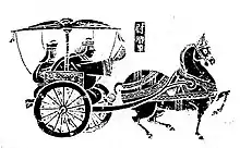 Its first depiction in artwork was on lacquer-ware boxes from the ancient State of Chu.[8] This type of harness put pressure upon the sternum, where the line of traction is directly linked with the skeletal system of the horse, allowing for nearly full exertion.[5] It was in universal use by the time of the Chinese Han dynasty (202 BC – 220 AD), depicted in artwork of hundreds of different carvings, stone reliefs, and stamped bricks showing it featured on horses pulling chariots.[9] This type of breast-strap harness became known in Central Asia and elsewhere with the Avars, Magyars, Bohemians, Poles, and Russians during the 7th to 10th centuries.[10] After Central Asia, the first breast-strap harness was spread to Europe by the 8th century (in depicted artwork),[7] and became more widespread by the following 9th century (for example, depicted in a tapestry of the Oseberg ship burial).[11]