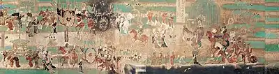 The same basic design is seen in other painted Chinese frescoes, one from 520 to 524 AD (with shafts projecting beyond the horses chest for sternal traction), and another circa 600 AD (Sui dynasty).[15] This Sui dynasty depiction (in cave 302) is of particular interest, since its depiction of the horse collar is not only more accurate (the same seen even in north and northwest China today), but it is used for a camel, not a horse.[16][17] The Chinese had used camels often from the 2nd century BC onwards during the Han dynasty, and there was even a Camel Corps serving the military on the frontier of the Tarim Basin.[17] However, the adapted horse collar for camels would not have been common until the 6th century.[17] In cave 156, there is a panorama painting of the Tang dynasty Chinese general and provincial governor Zhang Yichao riding triumphantly after the recapture and conquest of the Dunhuang region from the Tibetan Empire in 834 AD.[18] According to evidence provided by Dr. Chang Shuhong, the date of the painting is precisely 851 AD, yet Needham points out that there is universal consensus amongst historians that it was painted anytime between roughly 840 to 860 AD.[19] This latter painting accurately depicts the horse collar, with a well-padded collar coming low on the chest and rising behind the cross-bar.[20]