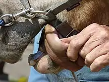 The horse tongue is highly sensitive, and therefore vulnerable to injury.[3][40] The main cause of lingual injuries in horses is man-made, and comes from wearing a bit.[3] A horse tongue may also hang over the bit for a variety of reasons, particularly if the rider's hand is too hard or if the bit is not adapted to the horse's mouthpiece, thus preventing the rider from controlling the horse.[41] The horse may then let its tongue hang out to the side.[41] This behavior is to be distinguished from tongue stereotypies, as its origin is not the same.[42] To avoid this problem, there are "snaffle" bits and anti-tongue breakers to be added to the mouthpiece.[43]