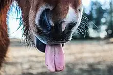According to ethologists Gerry and Julia Karen Neugebauer, horses use their tongues for licking, chewing, submissive behavior, yawning and drinking.[15] Unlike cattle, they do not generally use their tongues for mutual grooming.[16] During close exploration, horses examine a new object, sniff it, and if the smell pleases them, may touch and taste it using their lips, vibrissae, teeth and tongue.[17]