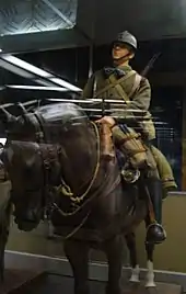 The French Army partially motorized their cavalry in 1928, creating divisions of dragons portés (mobile dragoons) that combined motorized and horse-mounted elements.[8] In the following decade the French searched for a perfect mix, testing five different divisional configurations.[9] Bulgaria, Hungary and Romania followed the French mixed pattern; Austrian and Czechoslovak mobile divisions were similar but with a higher share of horses.[8] The Polish Army acquired tanks and the Lithuanian army acquired trucks but otherwise both remained horse-powered, World War I style armies.[10] The United States Cavalry commanders approved the French strategy[8] but made no radical changes until the 1940 reform that completely eliminated horse troops.