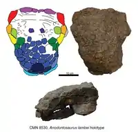 Walter Coombs (1971) synonymised Anodontosaurus lambei with E. tutus. However, recent studies suggest that Anodontosaurus is distinct enough from Euoplocephalus to be placed in its own genus and species.[8][13] Furthermore, all Horseshoe Canyon Formation ankylosaurine specimens were suggested to be reassigned to Anodontosaurus.[9] | |||||