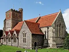 The Church of England parish church of St Michael has a 12th-century nave,[8] with an ornate Norman arch over the north door in the porch.[9] The north transept is 15th century[8] and the square bell-tower is late 16th century.[9] The aisle, chancel and vestry were rebuilt in 1875–76.[5][8] The exterior of the church is chequered with brickwork, limestone and flint. The tower is square and between 70 and 80 feet (21 and 24 m) high.[3][4] It has a clock, and the ring of bells was augmented from five to six in 1987.