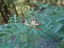 Hosackia crassifolia is a long-lived, somewhat bushy plant which bears long straight stems with evenly spaced oval-shaped leaves.[2]