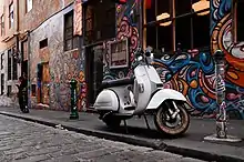 Hosier Lane opened as a Street Art Gallery in 1998 by the City Lights Initiative.[2] The lane is located opposite the entrance to the Atrium at Federation Square on Flinders Street, placing the lane prominent position in the city. The lane has been noted for the quality and the often political nature of its art.[3] It features in the state-sponsored book The Melbourne Design Guide and in Tourism Victoria's Lose Yourself in Melbourne advertising campaign, leading to questions about the dichotomy of Victoria's approach to graffiti.[4] The graffiti-covered walls and art-installations have become a popular backdrop for fashion and wedding photography. In 2013 street artist Adrian Doyle painted the entirety of the adjacent Rutledge Lane one color with the consent of the Melbourne city council to create a work he called "Empty Nursery Blue".[5]