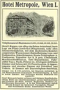 After the Anschluss of Austria to Nazi Germany in March 1938, the hotel was confiscated by the Gestapo who made it their headquarters. With a staff of 900 (80 per cent of whom were recruited from the Austrian police), it was the largest Gestapo office outside of Berlin. Many people, especially Jews, were interrogated or tortured there.[2][3] During the war the building was hit by a bomb and burned down and ultimately the ruins were demolished to eliminate any memory of the building.