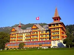 Since 1999, the hotel has been renovated in stages, with renovation of the terrazzo floors, stucco ceilings and ceiling paintings.[2] From the fall of 2009 to December 2011, the hotel was closed for a major refurbishment at a cost of 26 million francs,[3] with the installation of a new elevator, constructional reinforcement with fire and earthquake protection, new seminar rooms in the basement and a new kitchen. Likewise, the façade was completely renovated and the roof with the tower structures was repainted with the original pattern of the bricks.[4]
