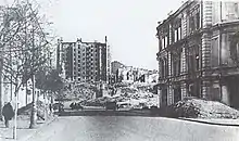 After Kyiv's liberation, during the cleanup of the streets and squares of the city from the ruins the remaining part of the Ginzburg house were pulled down. Symbolically on the 22nd of June, 1944 the City Council called for a competition for architects from Kyiv as well as other places from the republic and the union to develop a new project for a complete reconstruction of the central city. Most of them had provisions to place a new tall building on the place of the original Ginzburg house. The 1937 opinion of Alexander Dovzhenko about the Ginzburg house that all likewise constructions of Kyiv should be based on its geographical relief, was echoed in almost every project.