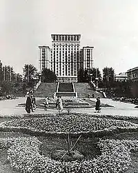 Hotel Ukraine (Ukrainian: Готель Україна), also referred to as Hotel Ukraina or Hotel Ukrayina, is a four-star hotel located in central Kyiv, the capital of Ukraine. It was built in 1961 as the Hotel "Moscow" in a location which originally was occupied by Kyiv's first skyscraper, the Ginzburg House. The construction of the hotel finished the architectural ensemble of Kyiv's main street – the Khreshchatyk – which formed the post-war reconstruction of central Kyiv. The hotel is state-owned and belongs to the State Management of Affairs.[1]