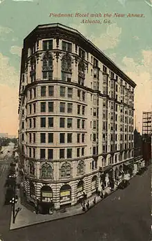 Following the war, Atlanta rebounded and began to rebuild at a rapid pace. New hotels arose to replace those lost during the war, including the Kimball House (1870) and the Markham House (1875). While many of the hotels before and after the war were built around State Square in downtown Atlanta, by the 1890s many of the newer hotels were being built north of the area along "upper Peachtree". Some of these notable buildings included the Majestic Hotel (1898) and the Piedmont Hotel (1903).[6][7] Also starting around this time, several hotels opened on Hotel Row near the newly opened Terminal Station in South Downtown. Among these was the Terminal Hotel, built in 1906 by prominent Atlanta businessman Samuel M. Inman.[8] However, stiff competition from other hotels in downtown caused the area to experience a decline a few decades later.[9]