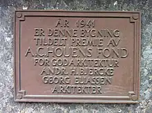 Plaque on the Norwegian Shipowners' Association building in Oslo, winner of the Houen Foundation Award in 1941