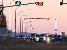 The Department of Main Roads undertook a further upgrade of the bridge's tidal flow system.[9] Commissioned in 2002 at a cost of $1.8 million, this upgrade included the replacement of the overhead arrow and cross signals with brighter, LED displays, monitoring of traffic flows and conditions with supervision of the system data and view of the bridge by CCTV at the remote Traffic Management Centre in Woolloongabba, Brisbane. Operators were for the first time also able to close and open lanes as required from the remote location.[10]