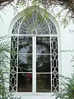 Houghton Lodge exemplifies this Cottage Ornée style; the principal reception rooms are placed on the ground floor, rather than on a piano nobile. The reception rooms, typical of the style, have french windows, shaded by a verandah, allowing immediate access to the garden. Many of Houghton's windows are in the exaggerated, decorative Gothic, almost Islamic, style which originated from the Walpole's Strawberry Hill Gothic.[6]