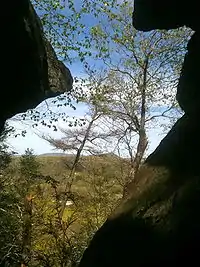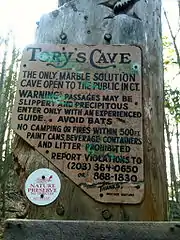 The Tory's Cave is the only natural "marble" true cave (created by water dripping and wearing away rock rather than by upheavals in the earth and rock) in Connecticut. A legend that Tories hid in the cave during the Revolutionary war has no factual basis. The cave is narrow at the opening, parts of it are physically closed off and it is wet inside with parts occupied by bats with "White Nose Syndrome". There is a warning sign outside the cave opening with safety rules including one that only experienced spelunkers should enter it; however, it is CLOSED indefinitely to protect the bats. Do not enter.