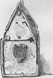 There are some thirty-five surviving medieval European examples, in various conditions, of which nine are Insular.[24] The majority are hip-roofed, with some gable-ended.[34] The best known Insular examples include Saint Manchan's Shrine, Ireland's largest surviving reliquary, the early 8th century Scottish Monymusk Reliquary,[35] the 8th or 9th century Lough Kinale Book Shrine,[26] and the 9th century Irish Breac Maodhóg.[7][36] Although a great many more where likely produced, most lost during Viking rates, 12th century Norman wars, later internal battles,[17] or were dismantled and smelted so the bronze and sliver could be sold off.[5]
