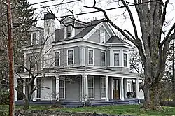 Built c. 1845, this two-story Greek Revival house is one of the first to be built when the Auburndale area was subdivided for suburban development. The 2+12-story wood-frame house has a porch, supported by paneled square columns, that wraps around two sides. Its gable roof, while oriented with the roof line parallel to the street, has a fully pedimented gable end, as do the dormers that pierce the roof.[2]