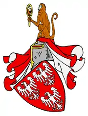 The von Tann coat of arms consists of three silver eagles (2:1) on a red field.[6] On the helmet with its red and silver mantle is a monkey holding a mirror in its right hand.