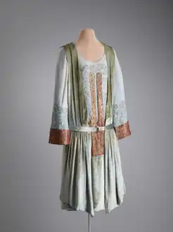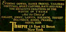 House of Thurn was a New York clothing store founded by Sidonie Thurn and continued by her daughter Carolyn Hague. The house, known by its label as Thurn, prepared made-to-order fashions for its wealthy customers. Begun as a small import shop in Brooklyn, Thurn occupied a succession of buildings on or near Fifth Avenue from 1870 to 1934. The last of these was a remodeled Gilded Age townhouse located between Madison and Fifth Avenues at 15 East 52nd Street. An article in Arts & Decoration magazine for July 1923 described this location as "a charming salon, all flattering French gray, with sparkling mirrors and gracious French furniture covered with satin damask of gray and gold."[1] In 1926, a writer for The Nation listed Thurn as one of the sixteen most exclusive houses in New York.[2] In 1937, the owner of one of these sixteen houses, said that Thurn had been "practically the highest class business establishment of the kind in New York City."[3]:89 Museum collections that hold Thurn fashions include the Metropolitan Museum of Art, The Los Angeles County Museum of Art, the Hillwood Museum, the Indianapolis Museum of Art, and the Fashion Institute of Design Museum, Los Angeles.