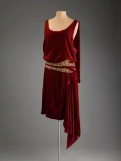 (9) Red velvet dress trimmed with metallic gold thread and red glass beads, early 1920s
