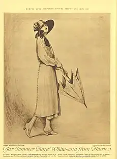 In 1922, Thurn placed an ad in Arts & Decoration magazine stating that its styles were "absolutely exclusive" enabling its customers to differentiate themselves from all other women.[37] A year later, Hague described her role as designer: "I make each gown for some specific type of woman. I see her, in my imagination, long before I begin to choose fabrics or to sketch details. I begin to picture her while I study the style tendencies of the season, and when I review the early collections of the great Paris houses; ... a skilled designer can do much by subduing, emphasizing and supplementing, to develop new aspects of a woman's charm."[1] Regarding the designs themselves, Hague said, "Thurn makes clothes for ladies. That is a hackneyed word I know. But how shall I put it? Our collections are always notably restrained... Our clothes are wearable. "That is why so many American women come to us, I think, instead of going to Paris for gowns."[16]