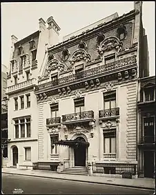 Before 1870, Thurn sold imported children's clothing from a small storefront in Brooklyn.[38] In that year, it opened its first shop in Manhattan at 50 East 10th Street near Broadway.[6] By 1873, it had moved further north to 884 Broadway.[8] By 1881, it had obtained its first Fifth Avenue address, at storefront at number 288, close to the corner of Fifth and 29th Street (see Image No. 13, above).[9] A few years later, Sidonie, who had previously held property jointly with her husband, bought him out to become sole owner.[39] In 1888, Thurn opened a shop for the summer season in Newport, Rhode Island and continued in business there through the first decade of the twentieth century.[40][41] In 1889 or 1890, Thurn again moved uptown in Manhattan, this time to 426 Fifth Avenue (see Image No. 14, above).[10] In 1913, Thurn made its final move, opening in a mansion at 15 East 52nd Street owned by the man who named and then promoted Ivory Soap as "99 and 44/100 percent pure" (see Images No. 15 and 16, above).[42] In announcing the lease, a writer for the Real Estate Record and Guide said, "the dwelling, built about eight years ago from plans by Donn Barber, is one of the finest in the city, all of the marble, woodwork, and decorations having been purchased abroad. Extensive alterations are to be made to the upper part of the building, but the main floor will be left as it is. The lease is for 21 years at an aggregate rental of $500,000."[31] In 1922, a writer described Thurn as a stately establishment having "high-studded marble rooms" for "the exquisitely ordered display of women's and young girls' frocks, cloaks and hats, and of their filmy dessous and negligées as well."[43]