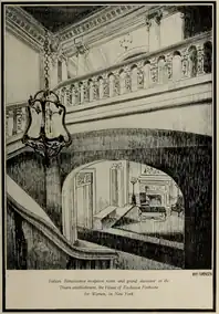 In 1914, Thurn occupied its final and principal location at 15 E. 52nd Street in Manhattan.[30] The building had been constructed in 1903 as a private residence for the sales director of the Procter & Gamble soap company. Designed by the American architect Donn Barber, the building featured imported marble and was said to be one of the finest mansions in the city.[31] Thurn had the interior of the upper floors modified for the use of its dressmakers but left intact the facade and ground floor with its elegant curved staircase (see Image No. 1, above). The twenty-one-year lease had an aggregate rental of $500,000.[31] When Thurn opened in the new location, the neighborhood was in a transition from residential to commercial. The Vanderbilt family had sold its properties along nearby Fifth Avenue and prestigious retail firms, such as the Cartier jewelry store, were taking their place. Hague later recalled that she and her mother perceived the 52nd Street location to be more prestigious than 57th Street.[3]:76[32]