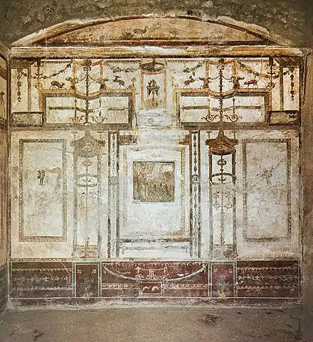 German archaeologists detected plaster edges of lost wooden door panels that could close the doorway between the tablinum and this cubiculum. Similar to the tablinum, this space has a black socle divided into panels with broadleafed green plants accented by yellow flower ornaments under the pilaster strips. The main zone is white divided into panels by dark red stripes. Panels are further detailed with filigree borders and floating emblems of opposing griffins, flying swans with heads turned back, dolphins, and jumping bucks. In the lunette of the alcove there is an outline of a peacock facing to the right and two round fruits.[22]