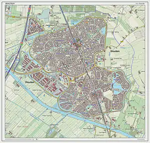 The main town in the municipality is Houten, a commuter town about 9 km southeast of Utrecht. On 1 January 2020, the town had 50,177 inhabitants (municipality). The built-up area was 5.08 km2 (1.96 sq mi) in area, and contained 20,010 residences in 2018. The slightly larger statistical district of Houten had a population of about 39,100 in 2004.[4]