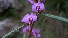 Hovea longifolia commonly known as rusty pods,[2] is a flowering plant in the family Fabaceae, endemic to eastern Australia. It has purple pea flowers, linear leaves with rusty felt like hairs on the lower surface.