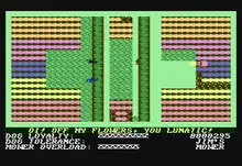 As well as grass, the playing area also includes hedges through which the mower cannot be moved,[5] and flowers. Mowing flowers results in a second antagonist, the gardener, appearing who pursues the player in the same way as the neighbour.[6] Unlike the neighbour, the gardener will not walk over the existing flowerbeds. Moving the mower too fast results in the mower heat gauge rising; if it reaches maximum, the mower will stop moving until the gauge drops back to a particular level. It usually results in the player being caught by the neighbour or gardener.