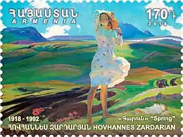 Back in Armenia Zardaryan collaborated with different artists on the State commanded large scale paintings. 1956 and 1958 he participated in international exhibitions in Prague and India as well as Biennale in Venice. His 1956 painting Spring won a silver medal at the Expo 58 in Brussels.[2] It was featured on a 1974 stamp of the Soviet Union and on a 2018 stamp and a 2018 commemorative silver coin of Armenia.[5] For many years the painting was exhibited at the Tretyakov Gallery.[4]