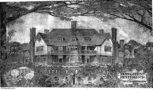 Mowbray Charrington, of the brewing family, commissioned Weir Schultz to design a small country house for his family on the site of an existing farmhouse at How Green. It was completed in 1905, at a cost of £5,000. A typical terraced house at that time would have cost about £100. The plan was of the ‘Butterfly’ principle, the wings being angled to take full advantage of the view over the Eden Valley, and perfectly orientated to enjoy the maximum sunlight. The design was shown at the Royal Academy in the summer of 1906, and published in The Builder. The house forms a crescent on the north side, dominated by three equal gables, but the scale is reduced by lowering the roofs over the servants and kitchen areas. The oak—panelled entrance hail with its fine tile and brick fireplace gave access to the sitting room, dining room, library and billiard room. A generous oak staircase ends in an arcaded gallery, originally leading to seven bedrooms. A secondary staircase led to the second floor servants' quarters. The garden, set in 33 acres (130,000 m2) of woodland, orchards and paddocks was carefully landscaped, the terrace being enclosed by a balustraded wall and a box hedge taking account of a fine three-hundred-year-old oak tree. The surrounding garden falls away into a tree- and rhododendron-bounded natural area, including two ponds. Schultz's design was drawn by Cecil Wood, a young architect who worked for him from 1903 to 1905.[2]