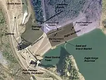 The Howard A. Hanson Dam is an earthen embankment structure at a length of 675 ft (205 m) and height of 235 ft (70 m). The base of the dam is 960 ft (290 m) wide and sits within Eagle Gorge, a ravine with nearly vertical rock walls. The reservoir withheld by the dam collects water from 220 square miles (570 km2) of drainage area; it is 7 miles (11 km) long. The dam structure contains a concrete spillway on its left side capable of discharging overflow at 107,000 cubic feet per second (3,000 m3/s). The spillway is controlled by two 45 x 30 ft (15 x 6 m) Tainter gates while an outlet tunnel at the base of the dam is controlled by two 10 x 12 ft (3 x 4 m) Tainter gates.[1]