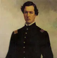 Burnham was sent to the 10th Regiment Massachusetts Volunteer Infantry and received a commission as a second lieutenant in the 5th Regiment, United States Artillery in the Union Army.[3] He served impatiently for several months as a Union Army recruiting officer in Towanda, Philadelphia, New York City, New York, and Dubuque, Iowa, until he was ordered to Fort Hamilton, New York, on garrison duty.[2] He went to Washington, D.C., for an assignment as Aide-de-camp to his uncle, Major General Joseph K. Mansfield, commander of the XII Corps, Army of the Potomac, but before he had the chance to join his staff, Mansfield was killed at the Battle of Antietam.[4]