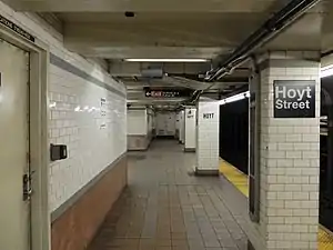 The Hoyt Street station is a local station on the IRT Eastern Parkway Line of the New York City Subway in Downtown Brooklyn, served by the 2 train at all times and 3 train at all times except late nights.
