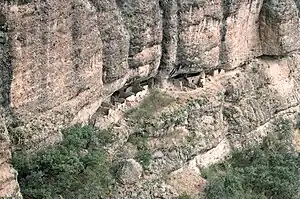 This cave is composed of several small houses in a rock edge, at an elevation of two-thirds of the height of the almost vertical cliff.[15] Is a smaller cave, with two buildings, one of at least three rooms situated on the edge of the cliff and the other a two-story room in the middle of the esplanade, in the middle of the cave.[1]