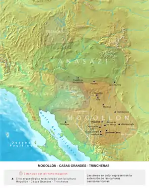 Important evidence exists of northern Mexico settlers, of the Casas Grandes culture, a sub-region of the Mogollon culture, that along with the Anasazi and the Hohokam comprise the Oasisamerica area. The northern cultural region is known in Mexico as "Gran Chichimeca" and in United States is called American Southwest.[12]
