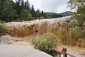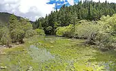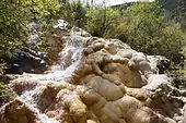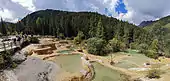 Huanglong (simplified Chinese: 黄龙; traditional Chinese: 黃龍; pinyin: Huánglóng; lit. 'yellow dragon') is a scenic and historic interest area in the northwest part of Sichuan, China. It is located in the southern part of the Minshan mountain range, 370 kilometres (230 mi) north-northwest of the capital Chengdu.[1] This area is known for its colorful travertine pools formed by calcite deposits, especially in Huanglonggou (Yellow Dragon Gully), as well as diverse forest ecosystems, snow-capped peaks, waterfalls and hot springs. Huanglong is also home to many endangered species including the giant panda and the Sichuan golden snub-nosed monkey.[1] In addition, a large population of the endemic orchid species 'Cypripedium plectrochilum' was discovered at the site [2] Huanglong was declared a World Heritage Site by UNESCO in 1992 because of its outstanding travertine formations, waterfalls and limestone formations as well as its travertine terraces and lakes rating among the three most outstanding examples in the world.[1][3]