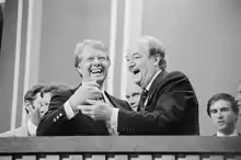 In 1960, Humphrey ran for the nomination against fellow Senator John F. Kennedy in the primaries. Their first meeting was in the Wisconsin Primary, where Kennedy's well-organized and well-funded campaign overcame Humphrey's energetic but poorly funded effort.[99] Humphrey believed defeating Kennedy in Wisconsin would weaken and slow the momentum of the latter's campaign.[100] Kennedy's attractive brothers, sisters, and wife Jacqueline combed the state for votes. At one point Humphrey memorably complained that he "felt like an independent merchant competing against a chain store".[101] Humphrey later wrote in his memoirs that "Muriel and I and our 'plain folks' entourage were no match for the glamour of Jackie Kennedy and the other Kennedy women, for Peter Lawford ... and Frank Sinatra singing their commercial 'High Hopes'. Jack Kennedy brought family and Hollywood to Wisconsin. The people loved it and the press ate it up."[102] Kennedy won the Wisconsin primary, but by a smaller margin than anticipated. Some commentators argued that Kennedy's victory margin had come almost entirely from areas with large Roman Catholic populations,[103] and that Protestants had supported Humphrey. As a result, Humphrey refused to quit the race and decided to run against Kennedy again in the West Virginia primary. According to one biographer "Humphrey thought his chances were good in West Virginia, one of the few states that had backed him in his losing race for vice-president four years earlier ... West Virginia was more rural than urban, [which] seemed to invite Humphrey's folksy stump style. The state, moreover, was a citadel of labor. It was depressed; unemployment had hit hard; and coal miners' families were hungry. Humphrey felt he could talk to such people, who were 95% Protestant (Humphrey was a Congregationalist)[104] and deep-dyed Bible-belters besides."[103]
